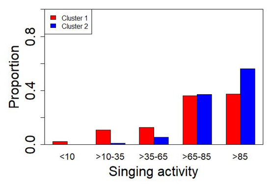 In order to provide a more solid interpretation of the results emerging from the cluster analysis, we checked for all the aural characteristics highlighted by an expert operator. In Figure 15, we illustrate the singing activity quantified as the percentage of singing presence in the audio recording time. In cluster 1, we have the presence of a significant proportion (26%) of recordings with low/moderate bird activity (<65%), an interval of activity between 65% and 85%, with a proportion of 36% equally distributed in the two clusters and a prevalence of recordings with singing activity above 85% of 56% for cluster 2 against 37% for cluster 1.