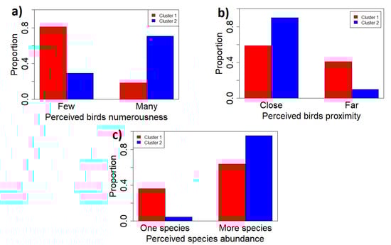 (a) Perceived singing abundance in the two clusters; (b) perceived singing distance in the two clusters; and (c) perceived abundance of species in the two clusters.