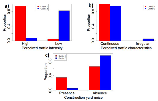 (a) Perceived traffic intensity in the two clusters; (b) perceived traffic characteristics in the two clusters; and (c) perceived construction yard noise in the two clusters.