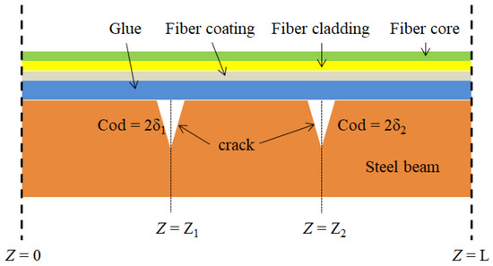 Accordingly, the present study proposed an optical fiber sensor adhered on a crack substrate (steel beam). Figure 1 shows the distribution optical fiber sensor with two cracks. The theoretical model contains two cracks (COD = 2δ1 and COD = 2δ2) along the optical fiber at Z = Z1 = 4.4 m and Z = Z2 = 10.6 m. The fiber core diameter is 9 μm, the fiber cladding is 125 μm, and the fiber coating is 250 μm.