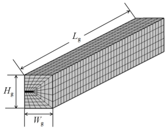 where β is the shear lag factor, which was 25/m consulted in the reference [29]. Figure 2 shows the finite element model in which the SMF28 optical fiber was used. The region may have to be divided into 23,546 mesh elements. The steel beam is a rigid body, so it was not used in the model. The cracks were applied to the bottom surface of the glue layer. Since the crack is axisymmetric, the middle section was built in the COMSOL software. The size parameter is Hg = 6 mm, Wg = 10 mm, and Lg = 106 mm. The mechanical properties of the materials can be consulted in the reference [28].