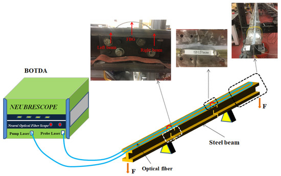 In order to evaluate the feasibility of the presented BOTDA sensor in the long beam with cracks, an experimental program was designed. Figure 3 shows a test bed, which was fabricated to apply the bending test in a 15 m length of beam. The beam was comprised of three sections at the length of 4.4 m, 6.2 m, and 4.4 m, and had two spliced points. The three sections of the beam were connected by bolts and plates. The beam was supported at two points with the span, and the force was applied at the ends. The damage could be fabricated in each splice joint through tightening or loosening the bolts at the plates. In order to monitor the crack opening displacements caused by loosening the bolts, an arch FBG displacement sensor was used. The detailed fabrication method can be consulted in the reference [30]. A single-mode optical fiber (SMF-28) was used as the sensing optical fiber over the beam. In order to maintain stability, the optical fiber was adhered by glue (epoxy resin) onto the top surface of the beam. An available BOTDA measuring system (Neubrex NBX-6055) was used for measuring the strain of the optical fiber. The BOTDA measuring system employs two light sources, including a pump light and a probe light. They transmit in two opposite directions via the separated optical fiber. The sampling interval and spatial resolution were set as SI = 5 cm and SR = 10 cm. The dynamic measurement was conducted at 26 Hz speed (26 measurements/s).