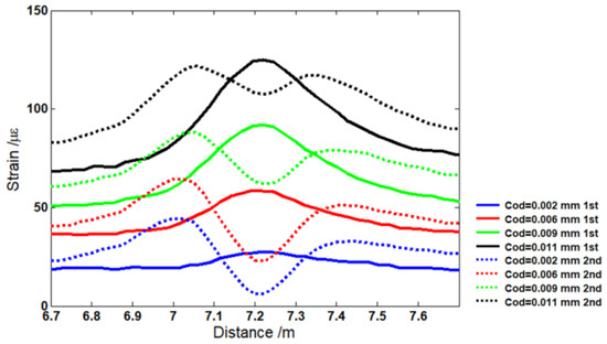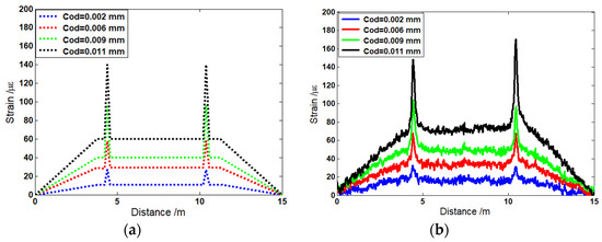 The theoretical and experimental results were studied and compared. For the simulation model, the strain distribution in the optical fiber with two cracks was studied. The distributed optical fiber sensor were assumed to undergo 49 N, 98 N, 196 N, and 392 N, and the crack opening displacements (CODs) were set as 0.002 mm, 0.006 mm, 0.009 mm, and 0.011 mm. Figure 4a shows the Brillouin frequency shift by numerical integration. It can be seen that when the applied force was increased from 49 N to 392 N, the strain in the middle section increased from 10.3 με to 60 με. Two distinct peaks appeared in the Brillouin frequency spectrum due to the two cracks. The amplitudes of the Brillouin peaks increased from 27 με to 140 με when the CODs at the crack’s location rose from 0.002 mm to 0.011 mm. In order to verify the theoretical analysis, distributions of strain were measured for the four CODs ranging from 0.002 mm to 0.011 mm. Figure 4b shows the distributions of strain along the length of the optical fiber from the experiments after filtering out the noise.