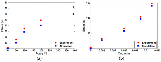 (a) Comparison of strain between theoretical and experimental results for F = 49 N, 98 N, 196 N, and 392 N. (b) Comparison of strain between theoretical and experimental results for COD = 0.002 mm, 0.006 mm, 0.009 mm, and 0.011 mm.