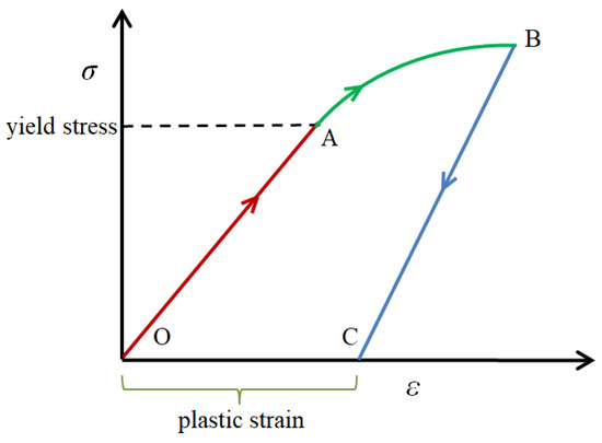 In order to ensure that the optical fiber can be re-used, the experiment was conducted for a second time. Figure 6 shows the comparison of the peaks in the crack strain region for the first time and second time. It was seen that the strain decreases at first and then increases along the crack region. This is attributed to the non-linearity of Young’s modulus of the optical fiber [31]. The strain response of optical fiber under continuous loading can be divided into two phases. In the first phase, the optical fiber can exhibit full strain recovery. In the second phase, residual strain occurs in the optical fiber and increases when the strain exceeds a certain threshold value. Figure 7 shows the relation between stress σ and strain ε for distributed optical fiber adhered to the beam surface. When the optical fiber performs in the red region (OA line), the stress and strain exhibits a linear trend. When the strain is larger than the yield stress, the optical fiber performs under a non-linear condition (AB line). In the two ranges of OA and AB, the optical fiber can return to its original memory shape once the stress is released. When the stress exerted upon the optical fiber reaches up to the value of spot B, the optical fiber is physically damaged and cannot return to its original shape, even in the no-stress condition. There will be plastic strain (OC line). In the experiment, due to the excess deformation of the optical fiber, the optical fiber was stretched again, and the stress in the central position decreased. Therefore, the crack below 0.009 mm can be used for the distributed optical fiber through testing the optical fiber characteristic.