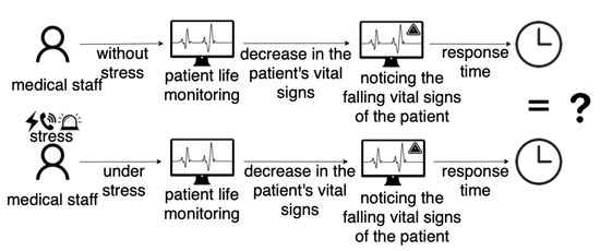 As stress and fatigue are integral components of the work of medics, the medical graphical user interfaces useful in a neutral (stressless) situation may not be compatible in rapid and emergency situations when users’ reactions can be fairly different. The problem is presented in Figure 1, where we indicate the possibility of differences in the reaction time of medical personnel to the decrease in the patient’s vital parameters in a neutral (stress-free) and stressful situation. That is, there may be different perception and observation of changes in the patient’s vital parameters depending on the occurrence of the stressors. If such a situation occurs, the cardio-monitor’s standard-setting is ineffective, and the physicians’ perception depends on the conditions prevailing during the monitoring of the patient’s condition.