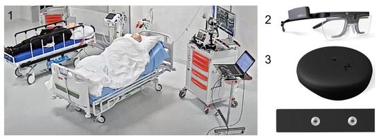 Experimental stand. 1—Composed of a bed on which a phantom (patient) lies, a cardiac monitor (Terra Monitor), 2—Tobii Eye Tracker Glasses 2 [18] with a laptop recording data, and 3—the wearable chest belt for EEG signal recording (AidLab) [19]. The stand is located in the Medical Simulation Center of Collegium Medicum of the University of Zielona Gora.