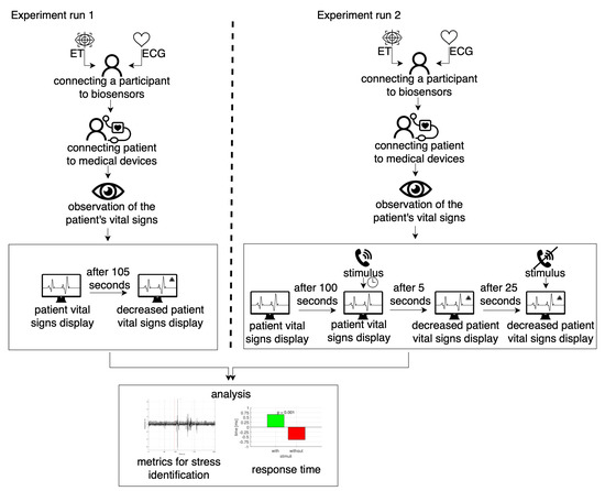 Our research is based primarily on the analysis of the medics’ eyes movements, i.e., which places of the patient’s life monitor are under the interest of medics in a stressful and stress-free situation. In order to be sure that the stimuli that the participants were subjected to indeed caused stress, we analyzed not only the subject’s eye movement with eye-tracker (ET signal) but also the heart rate record with a wearable chest belt for heart monitoring (ECG signal). As both ECG signal metrics (such as HR (ECG) and LF/HF (ECG)) and ET (such as pupil size and time of fixation) identify a stressful situation, they have been used in our analysis.