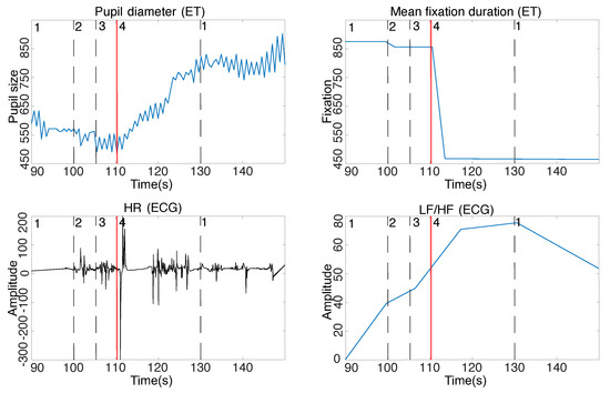 Top Left: change of pupil diameter; Top Right: change of fixation time; Bottom Left: ECC signal—change in heart rate due to ECG recording; Bottom Right: change of LF/HF metrics from ECG recording (sympathetic to parasympathetic response). 1—the moment of the experiment start (without the use of the stressor), 2—the moment when the patient’s vital signs began to drop on the monitor of the patient’s life, 3—the stressor swiched on, 4—the moment when the subject noticed the falling vital signs of the patient on the cardio monitor.
