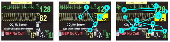 Left: Cardiac monitor used to perform the experiment. Middle: The course of the fixation trajectory of the respondents in a stress-free situation. Right: The course of the fixation trajectory of the respondents in a stressful situation. AOI—Area of interest (target place on the cardio monitor, where the patient’s vital signs fell), cyan spots—show the course of the subjects’ eye trajectories in the order from [1 to n].