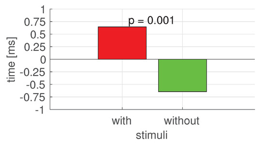 The difference in mean time reaction between situation with stressful stimulus (red) and without stressful stimulus (green). The p-value indicates the statistical difference between compared stimuli, computed by the Kruskal–Wallis test at a 0.05 significance level.