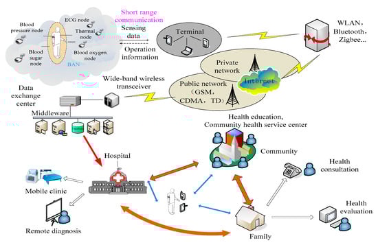- Heterogeneous interconnection framework. Any one WBAN and other WBANs, personal area networks, LAN, mobile communication networks and the Internet connect together, which is affecting WBAN technology and the development of important technical factors. A heterogeneous network includes two aspects: the interconnection of heterogeneous nodes and a heterogeneous network. On one hand, a common data representation and flexible network connectivity structure should be proposed for internal heterogeneous nodes in a WBAN with the purpose of having interconnections between all kinds of sensor nodes and interconnections between nodes and gateways [106]. On the other hand, to aim at connections between the WBANs and other types of heterogeneous networks, it is necessary to build a common data communication and protocol conversion interface to complete the interconnection of WBANs and the Internet, mobile communications networks and other mainstream networks [107,108]. From the above, the former is conducive to interoperability and interconnection among WBAN devices, and the latter can provide network-level technical support for the implementation of telemedicine, which is significant for remote continuous monitoring.