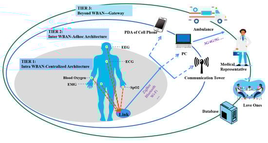 - In-network cooperation and feedback optimization. Different heterogeneous nodes cooperate with each other and complete human monitoring and information processing and transmission. This is an important feature of WBANs. To establish a dedicated WBAN architecture, it is essential to develop a collaborative framework and mechanisms between network nodes. These mechanisms include sensor-related technology of event-driven information transfer methods, sleep–wake-up mechanisms and monitoring information data fusion mechanisms [104,105]. It is worth noting that there are usually a lot of feedback loops in a WBAN which could conveniently control the reverse information transmission; thus, how to design closed-loop controlling methods and the corresponding protocol is an important issue for WBANs.