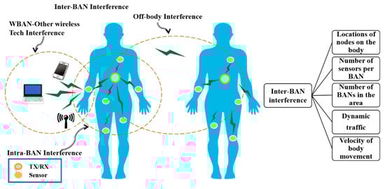 - With the development of the Internet of Things, the increasing number of WBANs and the mobility of WBANs, interference is becoming more challenging. For a single WBAN, intra-BAN interference can be effectively avoided by using TDMA techniques, but multiple WBANs interfere with each other when they are co-located (i.e., inter-WBAN interference). Figure 4 describes the different types of interference in WBANs [109] and the parameters that cause inter-BAN interference.