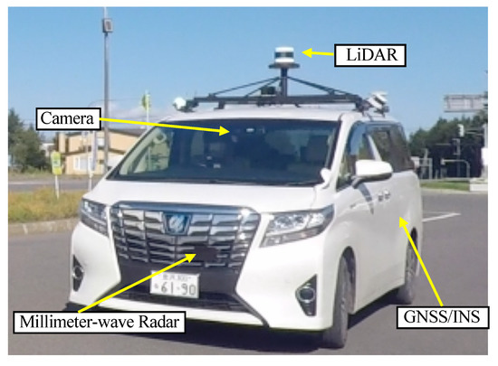 As a prerequisite, the vehicle and sensor configuration used in this study are described. The test vehicle and sensor configuration are shown in Figure 1. The vehicle is equipped with an Applanix POS-LV220 GNSS/INS(Global Navigation Satellite System/Inertial Navigation System) that acquires position (latitude, longitude, and altitude) and attitude angle (roll, pitch, and yaw) at a frequency of 100 Hz. In this study, positions, where off-line post-processing corrections were performed on the POS-LV220 data, are used as ground truth in the evaluation.