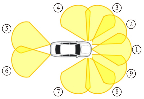 Sensor layout of millimeter-wave radars. The vehicle has nine radars. The numbers are sensor IDs.