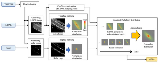 Figure 3 shows the flowchart of the proposed localization framework. When data is acquired from LiDAR and radar, the data is matched with a map for each sensor. Matching is performed on an image basis, resulting in a correlation distribution. The probability distribution of the offset is updated by a histogram filter using the correlation distribution as the likelihood of the offset.