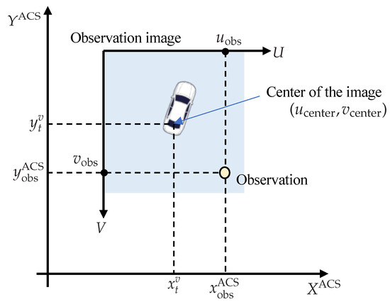 To consider quantization errors in mapping, the position of the center pixel in the absolute coordinate system is computed from Equation (4). Then, a point cloud of the road surface is projected onto the image. An arbitrary LiDAR observation point is mapped to a pixel according to the relationship shown in Figure 4, which is obtained by Equation (5).