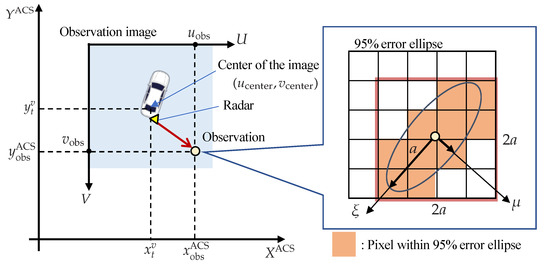 Since millimeter-wave radar has lower ranging accuracy and angular accuracy than LiDAR, the mapping needs to consider the sensor characteristics. The probability of the existence of a stationary obstacle, including the observation error, is projected onto the observation image as shown Figure 5. A projected pixel of the observed object can be calculated in the same way as for LiDAR. Next, consider the error ellipse of the observation position that extends around this pixel. This error ellipse can be computed from elements in the covariance matrix of observation information, especially concerning position only. The error model is based on the study in [20].