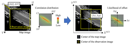 For each sensor, a correlation distribution is computed by template matching between the observed image and the map image. As shown in Figure 8, the correlation distribution is the distribution of similarity when two images are overlapped by a shift of . This method uses ZNCC (Zero-means Normalized Cross-Correlation) as the similarity. The correlation value is highest at the position corresponding to the vehicle’s location on the map image. It can be regarded as a likelihood distribution of offsets. Since the observation image is created centered on the vehicle origin and the map image is cropped around the estimated position of the vehicle, the offset is a shift in the center between the two images. Let be the center pixel of the map image and be the center pixel of the observation image, the relationship between the offset and the shift can be expressed by the following Equation (6).