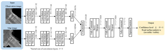 A classifier is created using a convolutional neural network (CNN), which is often used for image classification. Figure 9 shows the structure of the classifier for confidence estimation. Here, the architecture is modeled in reference to the method used to calculate the similarity between two images [22]. For each input image, convolution layers and max-pooling layers are used to extract features. The computed features are concatenated into a single vector. The feature is learned using fully-connected layers, ReLU activation functions, and dropout layers, and finally, a sigmoid function converts the computed result to a value between 0 and 1 and outputs it as a confidence level.