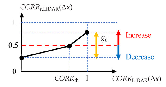 Next, the correlation values are transformed into probabilities, and the distribution obtained here is regarded as the likelihood distribution at the current time. The binary Bayes filter increases the posterior probability if the observation probability (likelihood) is greater than and decreases the posterior probability if it is less than . Therefore, as shown in Figure 10, we transform the correlation so that the probability is if the correlation value is at a given threshold . In addition, the range of probability is adjusted according to the confidence level of the LiDAR matching results estimated by CNN. The likelihood of offset is calculated by (9).