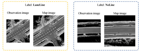 This section presents the results of the confidence estimation of the proposed model with training data. Train and validation datasets were created from data previously measured by the test vehicle. Observation and map images with visible road surface patterns were given the label “LaneLine”, while those with no visible patterns were given the label “NoLine”. The training was performed so that the model outputs 1 if the pattern is visible and 0 otherwise. Examples of training data are shown in Figure 11.