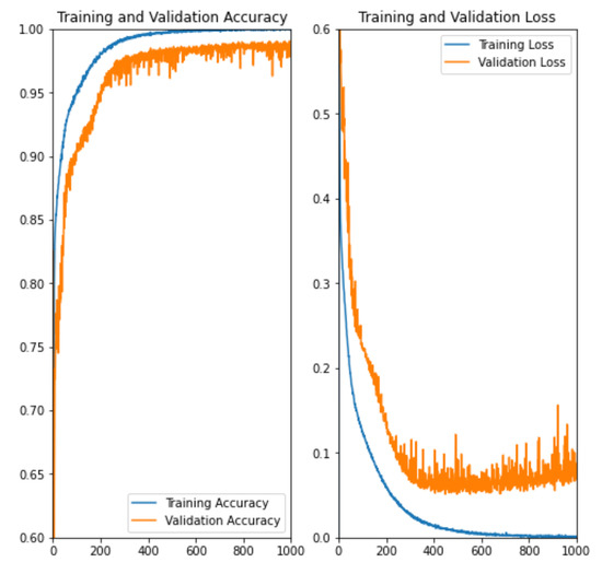 The Optimizer is Adam and the loss function is BCE loss [23]. The learning rate was determined to be , the number of epochs to be 1000, and the batch size to be 32. The data were randomly flipped horizontally/vertically and randomly rotated in the range of −180 to 180 degrees for data augmentation. The GPU used for training was an NVIDIA GeForce GTX 1070, and training took about 40 h. Figure 12 shows the training results of the model obtained with the above dataset and training conditions. Accuracy and loss for both Train/Validation have converged, and the learning process is progressing. Table 2 shows the Loss and Accuracy for the training and validation data at the end of training. Recall = 0.986 and Precision = 0.913 were obtained from the confusion matrix shown in Table 3. The results show that the system almost always correctly determines whether the road surface pattern is visible or not.