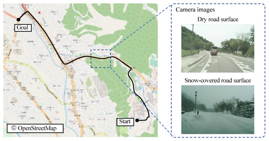 Next, we evaluate the accuracy of position when confidence estimation is integrated into LiDAR and radar-based localization. By applying post-processing corrections to GNSS/INS data, a very accurate position can be obtained. The post-processing position was used as the ground truth, and the errors of the estimated position in longitudinal and lateral directions of the vehicle were evaluated. For evaluation, experiments were conducted in two different environments: a dry road surface condition and a snow-covered road surface condition. The evaluation route is shown in Figure 13. The route is approximately [km] long and covers the urban area of Kanazawa, Ishikawa, Japan.