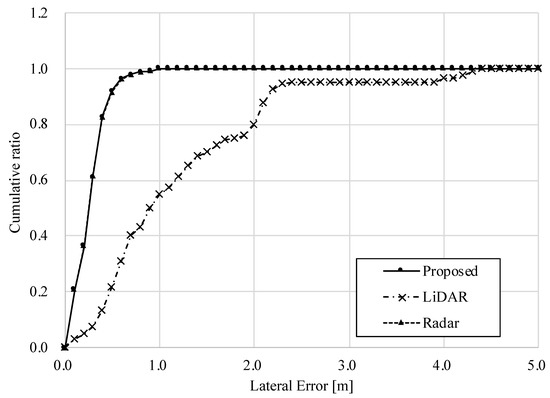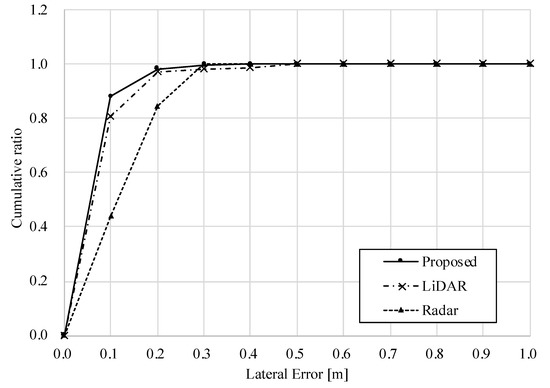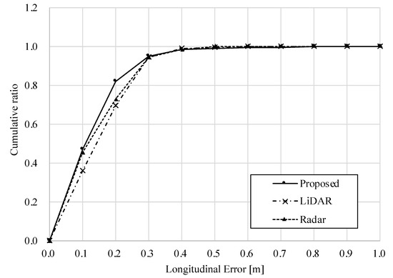 However, the graphs in Figure 14 and Figure 15 provide another perspective from which to evaluate accuracy. The horizontal axis of these graphs shows the amount of error, and the vertical axis shows the ratio of data within the error to the total data. For example, focusing on Figure 15, the percentage of the lateral error within [m] is about 84% for the standalone radar method, while it is about 98% for the standalone LiDAR and the proposed method. In other words, the standalone LiDAR method has more data for highly accurate position estimation than the radar method. Furthermore, the ratio of the proposed method is equivalent to that of the LiDAR results. Therefore, on dry road surfaces, both longitudinal and lateral accuracies of the proposed method are comparable to those of LiDAR-based localization.