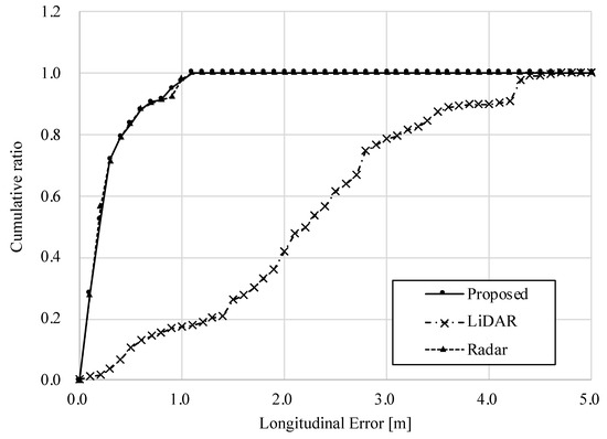 Table 5 show the RMS and maximum errors, and Figure 16 and Figure 17 show the longitudinal and lateral errors for each method on snow-covered road surface. Table 5 shows that the errors of the standalone LiDAR method are much larger than those of the radar one, which means that the position estimation is incorrect. Comparing the cumulative ratio of errors, the LiDAR method has a small percentage of data within a small error. The RMS and maximum errors of the proposed method are comparable to those of the radar method, and the charts of the ratio of errors overlap with the radar results in both vertical and horizontal directions. Therefore, it can be seen that in snowy environments where the road surface is not visible, the accuracy of position estimation is equivalent to that of a standalone radar system. In addition, the results of the proposed method show that more than 90% of the data are within [m] of the error. Considering that a typical road width is 4 [m], a [m] deviation corresponds to about 1/8 of the lane width. This error can cause, for example, a vehicle to drive close to the edge of the road when it is supposed to be traveling in the center of the lane. Although it cannot be guaranteed to be safe, the accuracy of the system is considered sufficient to achieve autonomous driving, assuming that the system can be covered by object recognition and path planning technologies.
