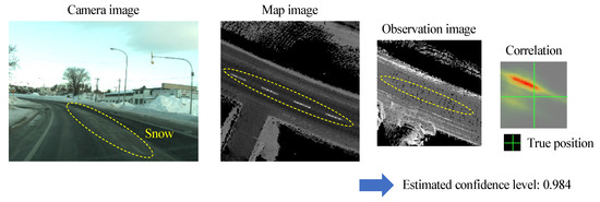However, this assumes that the observation image has the same appearance as the map image, and if the road surface is covered by snow, the pattern will be different from the map image and the correlation value may not be high at the correct position. Therefore, it is important to estimate the confidence level that the matching result is correct for LiDAR template matching.