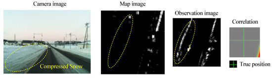 Example of incorrect matching of radar images. The area corresponding to the compressed snow shown in the camera image is circled by a dotted line in the map and observation images. It can be found that objects that do not exist in the map image appear in the observation image. Because the features between the two images are quite different, a peak of correlation appears at a location that deviated from the true position due to the matching.