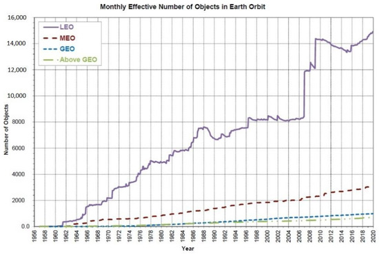 According to the US NASA Orbital Debris Program Office, more than 27,000 orbital debris larger than 10 cm are catalogued. The estimated population of particles between 1 and 10 cm in diameter approximates 500,000, while the number of particles larger than 1 mm exceeds 100 million. In 2020, it was estimated that the amount of material orbiting the Earth exceeded 8000 metric tons, with most orbital debris located within the first 2000 km in height above the atmosphere. Extensive studies have concluded that the majority of space debris, operational satellites, and spacecraft are present in the low Earth orbit (LEO), as presented in Figure 1 [3,4].