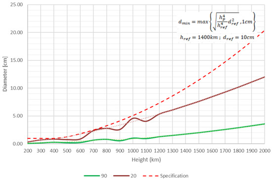 The system was designed to track all LEO-resident objects (200–2000 km) within the tracking capabilities of the antenna and having sizes above the following perigee-altitude (hp)-dependent diameter envelope (dmin), with href = 1400 km and dref = 10 cm [20]: