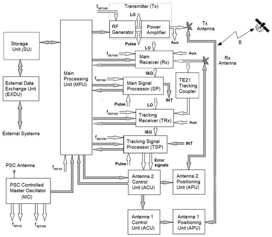 The sum channel echo signals are received at the RHCP port of a 6 GHz OMT of the Rx Antenna and then are fed to the input of the main receiver. They are filtered, frequency translated and demodulated using the LO signal, and amplified to the value required by the optimal operation of an analog-to-digital converter (ADC). To mitigate the increase of phase noise and interferences due to Tx–Rx coupling through antenna spill-over, obtrusive objects, or transmission mismatch, the main receiver (Rx) employs digital self-interference mitigation phase noise cancellation techniques.