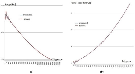 The values resulting from the measurements and after applying an alpha–beta filtering process for range and Doppler speed were in good accordance with the estimated ones (calculated from the two-line elements data) [33]. In Figure 8a,b the two sets of values for range and Doppler speed are plotted for spatial object COSMOS2932. On the x-axis, the time unit is the trigger timing of the analog-to-digital converter, with the full scale of 151 triggers corresponding to approximately 237 s of measurement time.
