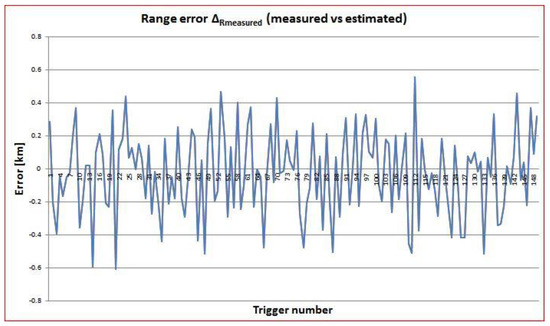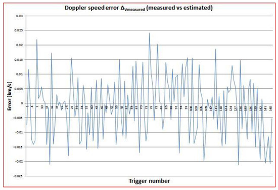 In order to estimate the accuracy of the measured values for range and Doppler speed in comparison with the theoretical estimated values, the differences ΔRmeasured = Rmeasured − Restimated and ΔVmeasured = Vmeasured − Vestimated were also computed and plotted in Figure 9 and Figure 10. The estimated values were obtained from the TLE values. It was shown that these errors were quite small. The range error was inside an interval of less than ±0.6 km compared to the mean range of 1923 km for COSMOS2932. The Doppler speed error belonged to an interval of ±0.02 km/s compared to the mean speed of −1.785 km/s for COSMOS2932. Similar corresponding values were obtained for the other four spatial objects targeted.