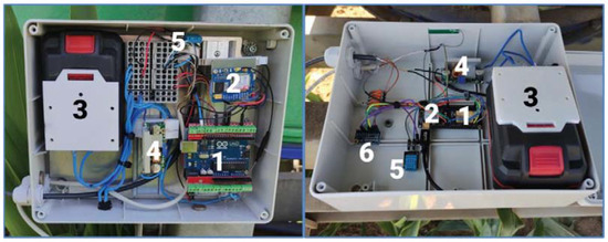 Designed devices E1 and E2 for sprinklers, (E1-left, 1-Arduino Uno, 2-module SIM, 3-source with terminal, 4-voltage divider, 5-sensor DHT11; E2-right, 1-Arduino LilyGO TTGO v1. 4, 2-module SIM, 3-source of power supply, 4-voltage divider, 5-sensor DHT11, 6-ADS1115).