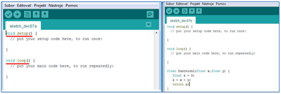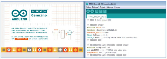 The software was designed and programmed on the open-source development platform Arduino (Figure 8). It is based on the C programming language. This platform includes the Arduino IDE development environment, which launches many communication, math, and sensor libraries that help programmers implement various interfaces, such as sensors, communication modules (Wi-Fi, Bluetooth), and the like. The Arduino IDE development environment is offered for all used Windows, Linux, and MacOS operating systems. The advantage of this platform is many freely available projects and solutions to programming problems, which the user can download and modify as needed. The sequence and state culture must be observed when writing the program.