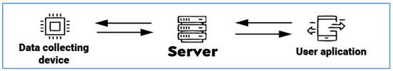 Another important part of the proposed communication system (Figure 10) between the device and the user application for hose reel irrigation machines is the server, which at certain time intervals processes the data sent from the proposed device (E1, E2) mounted on the irrigator. The capacity of connected devices to the server is limited only by the computing power of the server.