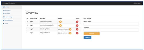 The administration interface (Figure 11) is designed to be simple and intuitive, where after logging in, an overview of deployed devices in field conditions is displayed. It is possible to add others to the existing list of devices (right side of the main menu window). The main menu consists, as already mentioned, of an overview of devices, graphical and tabular results, the option to set up devices or notifications, and the option to log out. After activating the overview window, we will see a list of devices with an ID code, name, and activity indicator. Graphical and tabular data of results for individual devices allows the software to monitor within the selected date and time (e.g., the exact period). In addition, the program interface allows you to determine the average values of the monitored parameters (temperature, humidity, pressure, and winding speed). When selecting a table export, the results are available in five columns (ID—Record number, auto-incremental; SID—Specific device number; Datatype—data type, such as position or temperature; Data—column of measured data itself, and Timestamp—time stamp when the data were sent on the server).