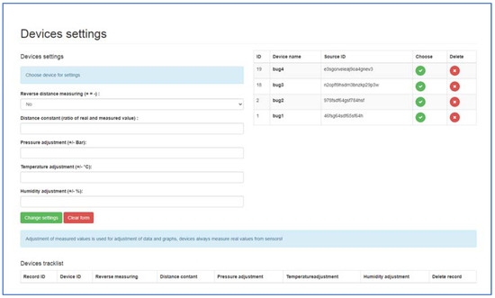 When selecting under windows (device settings) from the administrator main menu, setting options are offered to the user (Figure 12). Different corrections can be selected for each device. Corrections are used especially if the operator finds that the measured data of the device does not correspond to the real data and the operator does not have direct access to the corrections of the device itself, he can also perform the correction in the administration interface. The subjects of corrections are: