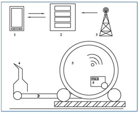 Block diagram of the principle of communication between the device and the smart device: 1—mobile smart device, 2—server, 3—signal GSM tower, 4—big gun sprinkler, 5—hose reel irrigation machine base frame, 6—data collection device.