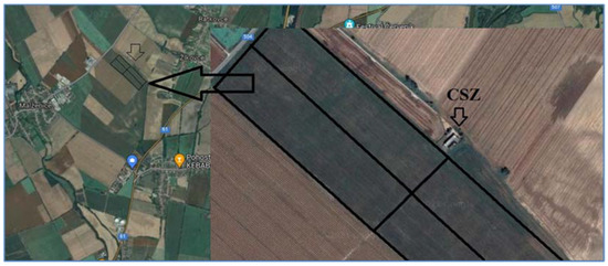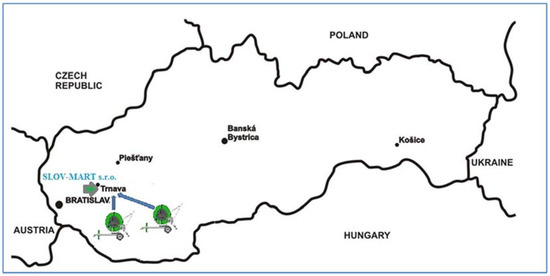 The practical verification of the designed devices’ correct operation took place in the field conditions during the irrigation of seed maize. The irrigation dose realized by the hose reel irrigation machines was set to an average value depending on the winding speed of the hose on the spool. The irrigation dose represents the amount of water delivered per unit area in one uninterrupted time interval until the effective watering depth is reached. Figure 14 shows the area of interest, and the land on which irrigation took place falls under the area of the agricultural enterprise SLOV-MART, ltd., Kátlovce. The company manages a total area of about 2000 ha, of which 530 ha are irrigated. In total, the company has applied irrigation so far in three different ways, where they are already discharging drip irrigation in terms of economic burden (it was about 70 ha). In addition to drip irrigation, spray irrigation is used for crops (wide-area irrigation technology—320 ha and hose reel irrigation machines—140 ha). Deployment of wide-angle machines is more advantageous for large plots of land, especially without obstacles (saving time of human needs for given irrigation work). Obstacles, such as power grids or others, prevent the efficient use of wide-area sprinklers, in which case belt machines (smaller irrigation areas and greater time requirements of manpower) find application.