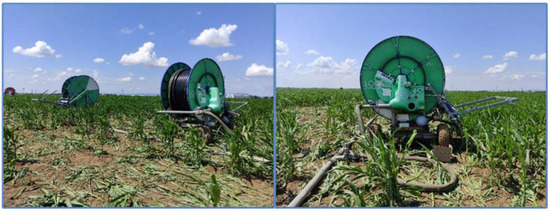 The source was a water pumping station, which takes water from underground sources (Figure 16). Water enters the irrigators under the prescribed pressure through the pumping station (pumps, electric motors, filtration, and control room), pipeline, and hydrants. The technical parameters of the applied hose reel irrigation machines and the weather conditions for specific measurements are given in Table 4. At the temperature, the range and average values are given.