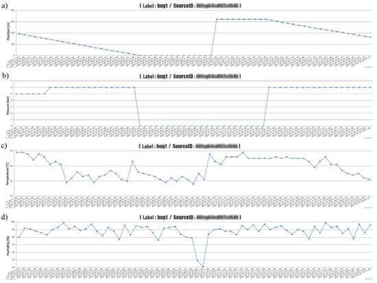 Graphic display of measured data from the administration interface—device Z1, (a)—pressure, (b)—distance, (c)—humidity, (d)—temperature.
