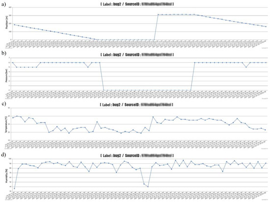 Graphic (Figure 17—Z1 devices and Figure 18—Z2 devices, the graph also contains sensitive data about a specific measuring device, which we filtered out for blurred reasons—blurred), and tabular (Table 5—one example in the form of export from the administration interface) results data for both devices, allowing the software on the PC or tablet to monitor within the selected time (date and time, or the exact time period). From the obtained monitored data, it is possible to assess the change in operating and weather parameters. At the bottom of the table, the export contains data on average temperature, humidity and pressure, or winding speed, calculated from the exported data. The graphical representation shows the course of reducing the length of the pulled-out hose (traveler distance from the spool) of one applied irrigation dose, the time of the device transfer, and the partial section of the next irrigation dose. The working pressure values were also zero when the sprinkler was moved. However, the monitoring of selected weather conditions did not depend on the implementation of irrigation, but only on the connection of the proposed equipment E1 and E2 to the energy source. The results show that within the investigated period of deployment of the proposed equipment, it is possible to filter the necessary time periods and obtain detailed information on selected weather and operating conditions, not only after the end of the work but also during it. The advantage, as pointed out, is also obtaining information about irrigator failures (pressure or winding).