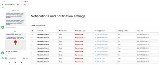 As already mentioned in the methodological part, we managed to successfully deploy in the system an innovated version of the device running on the motherboard LilyGO TTGO v1.4, a data collection device—MessageCenter (for better communication and crisis prediction capabilities). In the event of a fault that occurred during the tests, an SMS message was sent to the mobile device (sending a unique line). This link (thus also SMS) contained the type of machine failure and the exact GPS coordinates. The machine’s crisis subsystem also has an informative character when it can tell the operator the approaching end of the irrigation cycle. An example of a message is shown in Figure 19 (message: device speed fault, GPS coordinates of the device position are also listed for the message). The functionality of the entire monitoring and fault prediction system consisted primarily of sending a unique line to the server. In the second point, this link server processed and stored it in the database. In the third point, the MessageCenter device itself is present, which is built on the LilyGO TTGO v1.4 motherboard and programmed to constantly check the database of error messages with the data collection device. The list of administration interface faults in the MessageCenter section is shown in Figure 19. Another message was a pressure failure (if the pressure drops below 3 MPa, a message about a pressure failure in the system is sent).