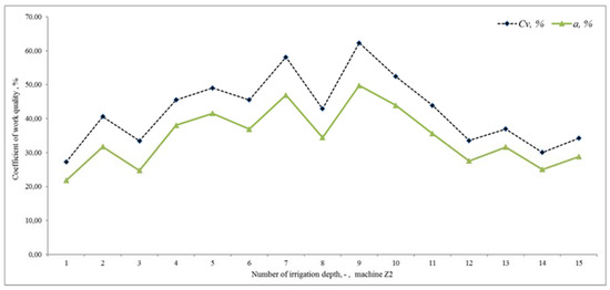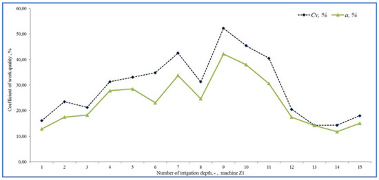 In the tested period, which lasted 16 days, irrigation took place with several Irtec hose reel irrigation machines (technical parameters are given in the methodological part of the paper), of which two irrigators were subjected to quality testing. The speed of winding the hose on the spool was evaluated, and the values were calculated from monitoring the wound distance in 10-min time sequences. The working position of irrigators (both) changed 15 times during the monitoring period. Irrigation time periods depended on the set irrigation dose (related to the speed of winding the hose on the spool), they ranged from 11 h to 16 h. The value of the operating pressure was monitored in the values of 0.5 to 0.6 MPa, the pressure failure occurred only once, and we removed it. The evaluation of the quality of work was based on the determination of the proposed coefficient of non-uniformity and the coefficient of variation for both proposed devices E1 and E2. Figure 20 presents the results of the work quality coefficients and Cv of the selected hose reel irrigation machine Z1 at 15 irrigation doses realized in succession. The results show that the results of the coefficient of variation Cv vary from 14.26 to 52.20% and the coefficient of non-uniformity and from 11.69 to 42.45%. Figure 21 shows the results of the variability of the stated quality coefficients of work at the second hose reel irrigation machine (more modern monitoring equipment, E2). The results show that the results of the coefficient of variation Cv vary from 27.23 to 62.29% and the coefficient of non-uniformity and from 21.80 to 49.74%. From the above, it can be concluded that with the reliability of monitoring the results of work designed by the equipment E1 and E2, the quality of hose reel irrigation machines was different. Based on the achieved measured and graphical results, statistical verifications of the significance of the impact of the selected hose reel irrigation machine and the coefficient of quality of work, on the one hand, and the impact of the included irrigation levy, on the other hand, were also performed. ANOVA one-factor analysis was used for statistical evaluation of the results, where the results showed a statistically significant influence of the applied quality coefficient of work and thus also the influence of a specific device (p < 0.05, Fcrit = 2.77). When evaluating the effect of the included irrigation dose, we also showed a statistically significant effect in both facilities (p < 0.05, F = 1.92). This means that when all coefficients and methods are introduced, there is a statistically significant difference between the examined coefficient values between at least two evaluation methods. If the null hypothesis is rejected, the alternative hypothesis comes into play. This means that not all mean values are the same (at least one of the mean values is different from the others).